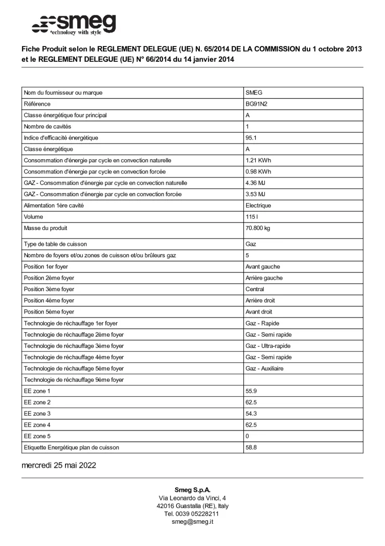 Piano de cuisson dessus gaz SMEG GAMME ELITE BG91N2