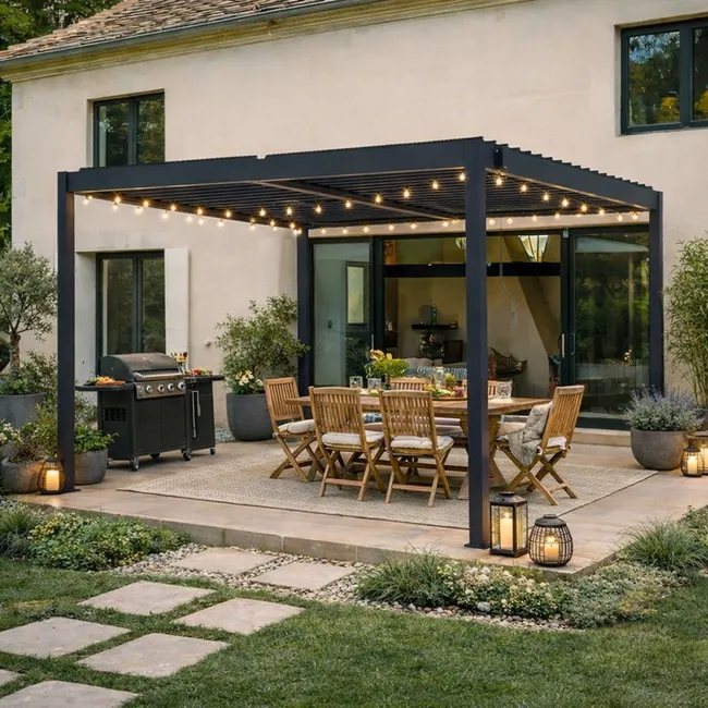 Son système de gouttières intégré à l’avant permet d’évacuer l’eau de pluie sur les côtés de manière efficace, ce qui renforce l’étanchéité de cette pergola.