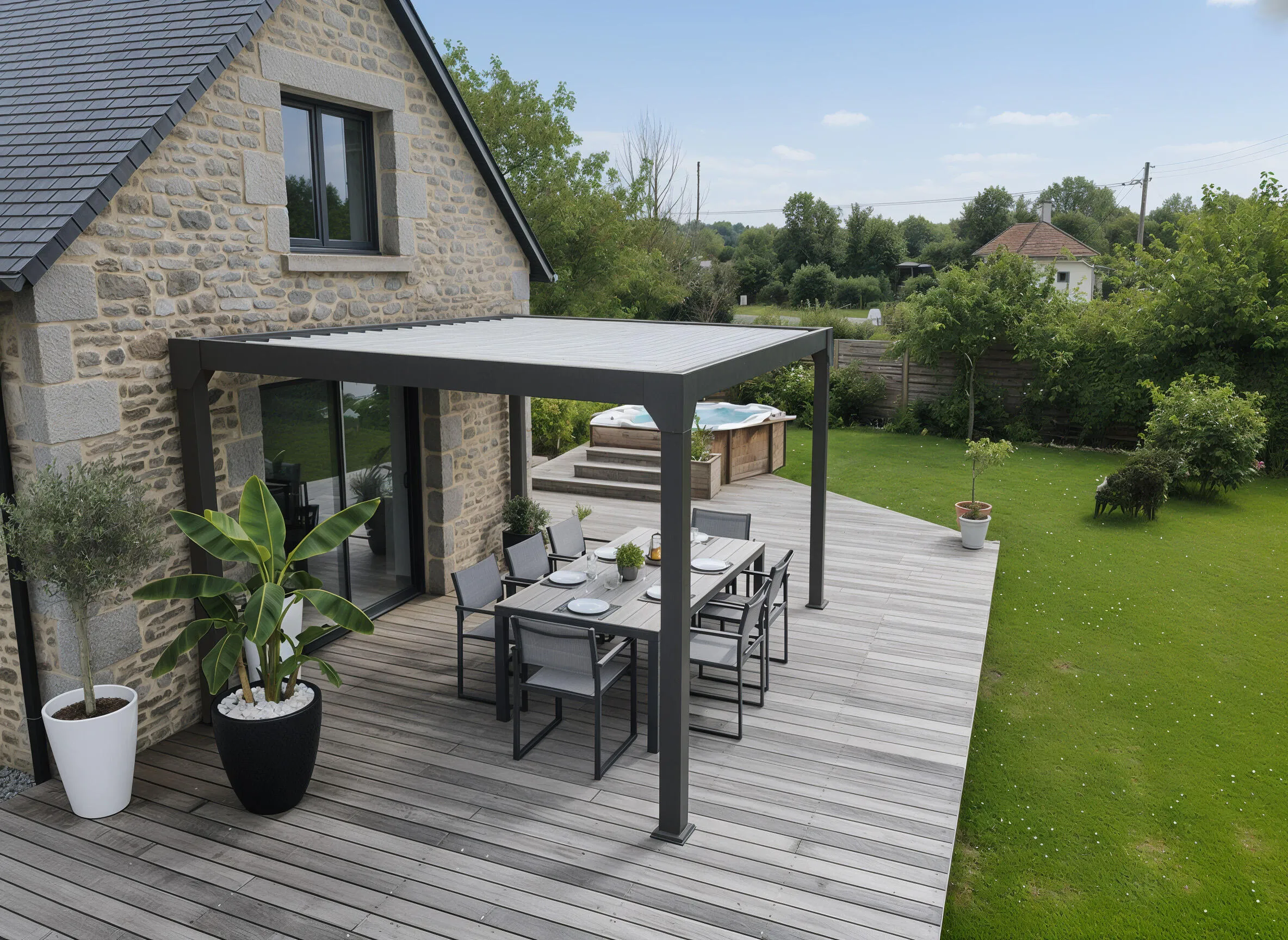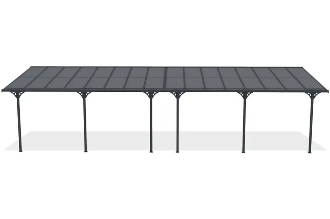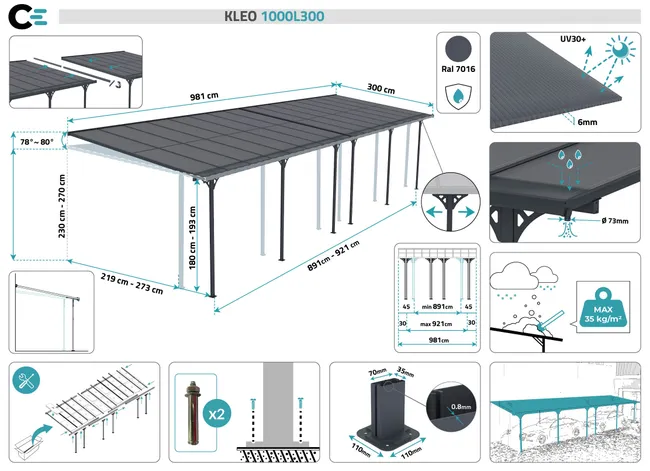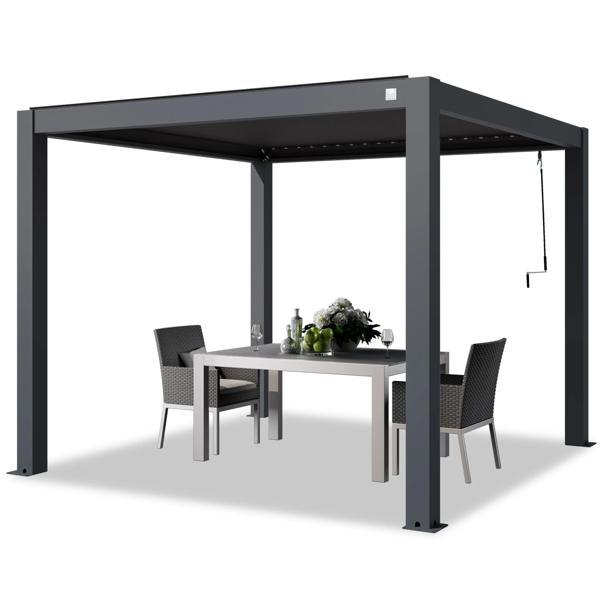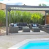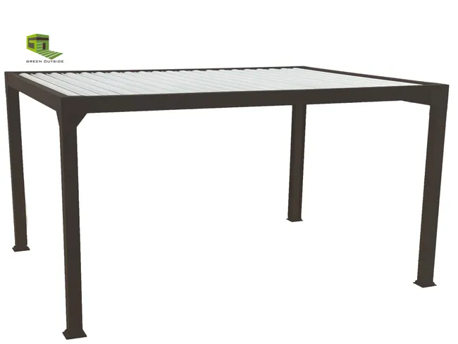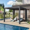 Pergola bioclimatique 4x3m structure et lames en aluminium noir Transformez votre terrasse ou jardin en un véritable espace de vie avec cette pergola bioclimatique en aluminium noir. Alliant design moderne et praticité, elle apporte une touche contemporaine tout en offrant un abri modulable qui s’adapte aux conditions extérieures et à vos envies. Ses lames en aluminium orientables permettent un contrôle précis de l’ensoleillement et de la ventilation. Légèrement inclinées, elles créent une brise agréable en laissant circuler l’air chaud. Complètement fermées, elles protègent efficacement de la pluie pour profiter de votre extérieur par tous les temps. En position verticale, elles laissent entrer la lumière pour réchauffer l’espace et illuminer vos journées. Sa structure en aluminium robuste garantit une excellente durabilité tout en offrant un entretien minimal. Conçue pour résister aux intempéries, cette pergola devient un élément central de votre aménagement extérieur, combinant esthétisme et performance. Avec ses dimensions généreuses de 4x3m, elle crée un véritable coin de détente de 12m2, idéal pour accueillir un salon de jardin, une table à manger ou un espace lounge. Parfaite pour prolonger les plaisirs du plein air en toute saison, elle s’adapte à chaque moment de la journée pour un confort optimal. Caractéristiques techniques Superficie : 12m2 Forme : Rectangulaire Couleur principale : Noir Structure : Aluminium Lames : Aluminium Lames orientables : Oui Nombre blocs de lames : 2 Manivelle incluse : Oui Connecteurs : Vis Entretien Enlevez régulièrement la poussière avec un chiffon sec. Nettoyez et essuyez avec un chiffon humide. L’utilisation de nettoyeurs à haute pression est déconseillée pour préserver la durée de vie de la pergola. Protégez le meuble en le recouvrant pendant les mois d’hiver ou inutilisés pendant de longues périodes. Dimensions Dimensions totales : 400 x 300 x 236 cm Dimensions d’une lame : 120 x 20 x 1.2 cm Dimensions pieds : 10 x 10 cm