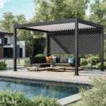 Votre extérieur toujours opérationnel Vivez en totale harmonie avec votre environnement sous la pergola bioclimatique rectangle Clima Astra. Grâce à ses lames orientables de 0 à 120°, vous maîtrisez parfaitement la luminosité tout au long de la journée et la ventilation naturelle sous cette pergola adaptative de 3 m x 4 m. En été, orientez les lames à l’aide de la manivelle pour apportez de l’ombre : la teinte claire des lames a été spécialement choisie pour réfléchir le rayonnement et éviter l’accumulation de chaleur. Une fois inclinées, elles créent un léger courant d’air rafraîchissant en laissant l’air chaud s’échapper. En hiver, ouvrez les lames pour laisser entrer la lumière et réchauffer votre intérieur. En position fermée, les lames orientent l’eau vers un système d’évacuation intégré aux pieds de la structure. Résistante et modulable Évolutive et personnalisable, la Clima Astra s’adapte à toutes les configurations. Cette pergola modulable peut recevoir des stores en textilène ainsi que des panneaux à lames orientables en aluminium, pour vous protéger du soleil rasant ou des vis-à-vis. Proposée en anthracite et blanc, cette pergola tout aluminium ne rouille pas, et résiste aux rayons UV et aux intempéries, pour un extérieur protégé. Ses lames double paroi offrent une résistance supérieure face aux conditions hivernales. Conçue avec une structure entièrement en aluminium (structure et lames) dont 50% d’aluminium recyclé dans la structure, cette pergola est gage de qualité et résistance. Une installation et un entretien simple au quotidien Conçue en aluminium haute résistance, la pergola bioclimatique se fixe au sol. Ses quatre pieds doivent être fixés sur un sol dur et à niveau. Autoportante, elle peut être installée au milieu du jardin ou adossée à la maison sans avoir besoin de percer votre façade. Veillez à bien suivre la notice de montage afin de garantir la bonne installation de ce produit sur votre terrasse. Une fois installée, votre pergola se nettoie facilement avec une eau savonneuse et un chiffon humide. N’hésitez pas à utiliser votre tuyau d’arrosage pour atteindre les zones les plus hautes. En hiver, et en cas de neige ou de vent, gardez les lames en position ouverte afin d’éviter la prise au vent et le poids sur les lames. Réparable, des pièces détachées sont disponibles pour prolonger la durée de vie de votre pergola.