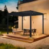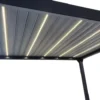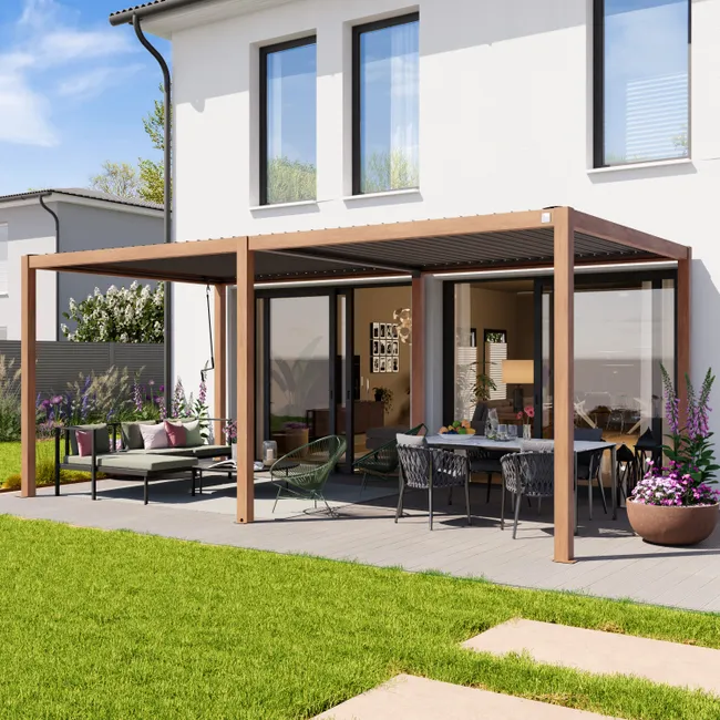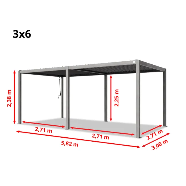 Votre extérieur toujours opérationnel Vivez en totale harmonie avec votre environnement sous la pergola bioclimatique rectangle Clima Astra. Grâce à ses lames orientables de 0 à 120°, vous maîtrisez parfaitement la luminosité tout au long de la journée et la ventilation naturelle sous cette pergola adaptative de 3 m x 4 m. En été, orientez les lames à l’aide de la manivelle pour apportez de l’ombre : la teinte claire des lames a été spécialement choisie pour réfléchir le rayonnement et éviter l’accumulation de chaleur. Une fois inclinées, elles créent un léger courant d’air rafraîchissant en laissant l’air chaud s’échapper. En hiver, ouvrez les lames pour laisser entrer la lumière et réchauffer votre intérieur. En position fermée, les lames orientent l’eau vers un système d’évacuation intégré aux pieds de la structure. Résistante et modulable Évolutive et personnalisable, la Clima Astra s’adapte à toutes les configurations. Cette pergola modulable peut recevoir des stores en textilène ainsi que des panneaux à lames orientables en aluminium, pour vous protéger du soleil rasant ou des vis-à-vis. Proposée en anthracite et blanc, cette pergola tout aluminium ne rouille pas, et résiste aux rayons UV et aux intempéries, pour un extérieur protégé. Ses lames double paroi offrent une résistance supérieure face aux conditions hivernales. Conçue avec une structure entièrement en aluminium (structure et lames) dont 50% d’aluminium recyclé dans la structure, cette pergola est gage de qualité et résistance. Une installation et un entretien simple au quotidien Conçue en aluminium haute résistance, la pergola bioclimatique se fixe au sol. Ses quatre pieds doivent être fixés sur un sol dur et à niveau. Autoportante, elle peut être installée au milieu du jardin ou adossée à la maison sans avoir besoin de percer votre façade. Veillez à bien suivre la notice de montage afin de garantir la bonne installation de ce produit sur votre terrasse. Une fois installée, votre pergola se nettoie facilement avec une eau savonneuse et un chiffon humide. N’hésitez pas à utiliser votre tuyau d’arrosage pour atteindre les zones les plus hautes. En hiver, et en cas de neige ou de vent, gardez les lames en position ouverte afin d’éviter la prise au vent et le poids sur les lames. Réparable, des pièces détachées sont disponibles pour prolonger la durée de vie de votre pergola.